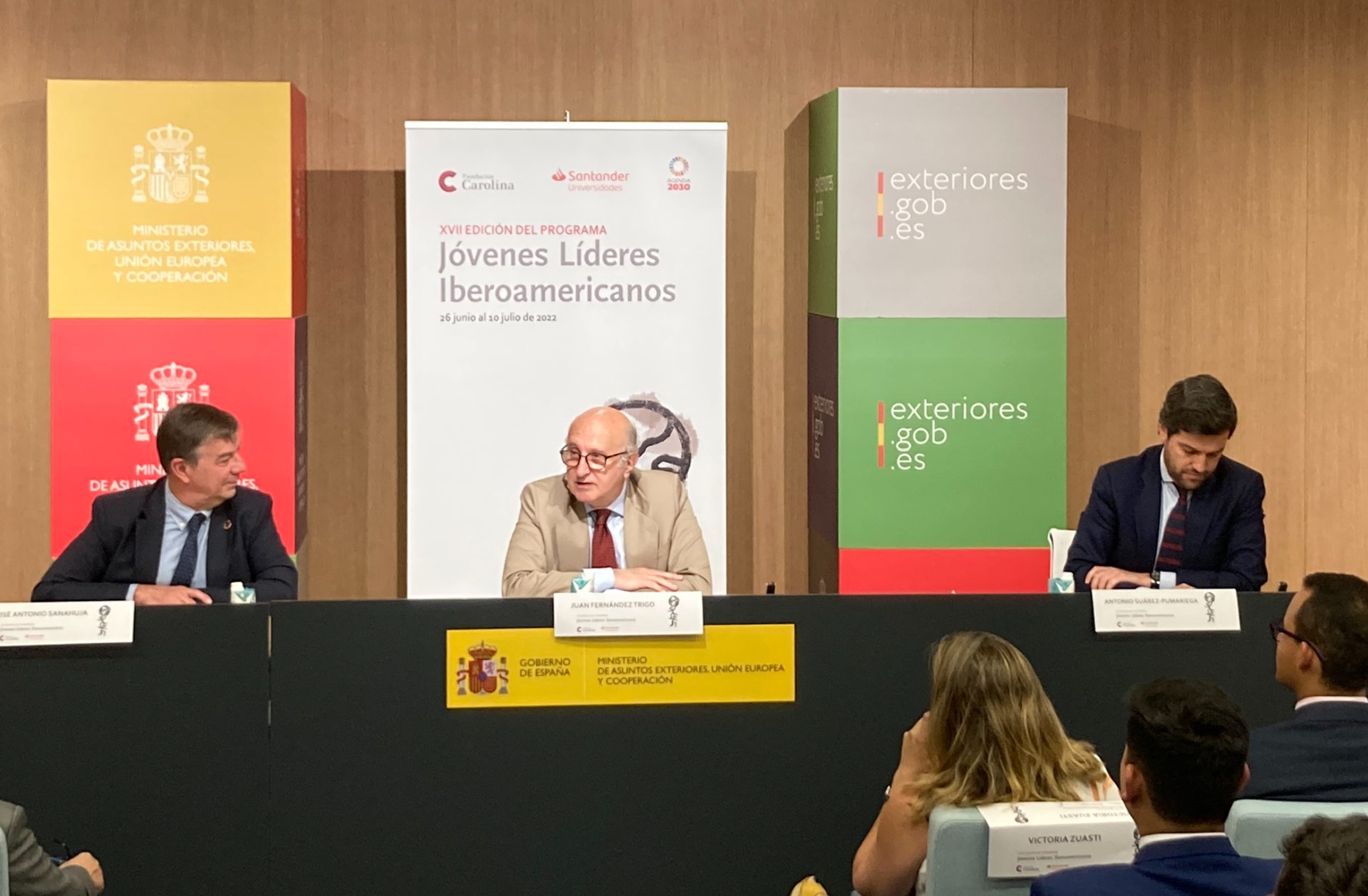 El 27 de junio se inauguró la XVII edición del programa Jóvenes Líderes Iberoamericanos, con la presencia de Juan Fernández Trigo, secretario de Estado para Iberoamérica y el Caribe y el Español en el Mundo, acompañado por los representantes de las instituciones organizadoras: José Antonio Sanahuja, director de Fundación Carolina, Hugo Camacho, secretario general y gerente de Fundación Carolina, Antonio Suárez-Pumariega, vicepresidente de Santander Universidades y Victoria Zuasti, directora de Programas de Becas Globales y Convenios Corporativos de Banco Santander.