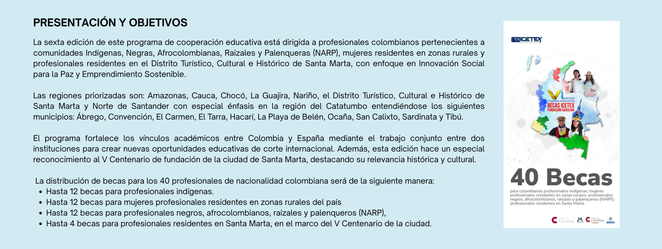 Se trata de la VI Edición del Programa de Becas Institucionales ICETEX – Fundación Carolina, la apuesta interinstitucional que este año estará dirigida a profesionales pertenecientes a pueblos NARP (negros, afrocolombianos, raizales y palenqueros) e indígenas, y mujeres residentes de zonas rurales del país, así como residentes de Santa Marta, distrito que celebra su quinto centenario de fundación.