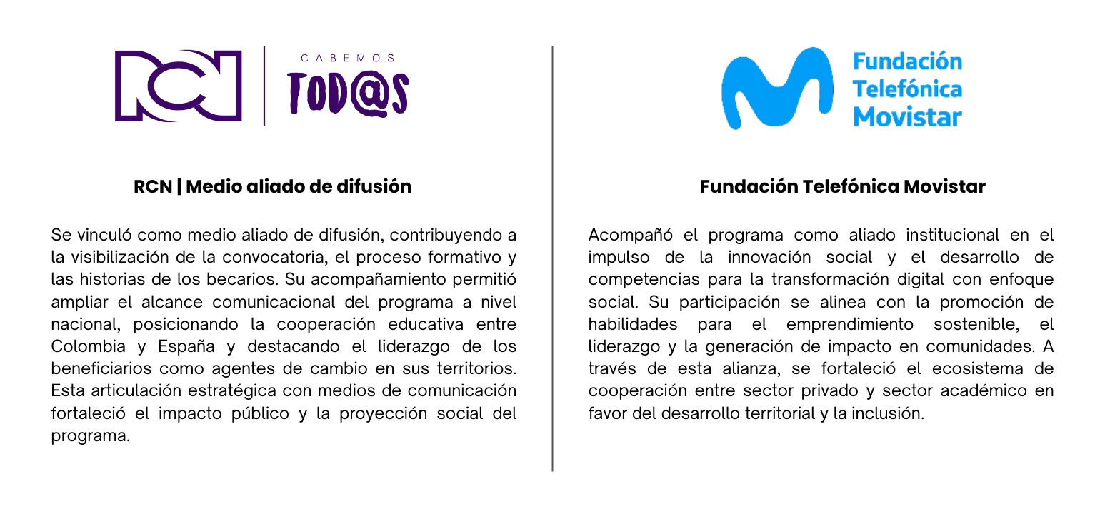 Los 40 colombianos tendrán la oportunidad de formarse con la Universidad Politécnica de Madrid en el programa ‘Innovación Social para la Paz y Emprendimiento Sostenible’. Esta experiencia transformadora combina dos semanas de formación virtual desde Colombia con una inmersión presencial de nueve días en Madrid.